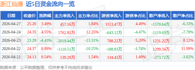 证券之星消息,截至2026年4月27日收盘,浙江仙通(603239)报收于25.2元,上涨3.49%,换手率3.67%,成交量9.93万手,成交额2.48亿元。