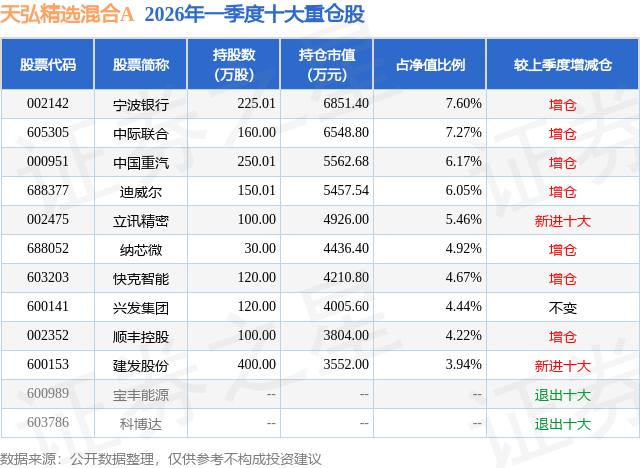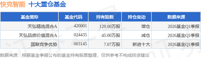 根据2026基金Q1季报公募基金重仓股数据,重仓该股的公募基金共3家,其中持有数量最多的公募基金为天弘基金的天弘精选混合A。天弘精选混合A目前规模为7.97亿元,最新净值1.2149(4月24日),较上一交易日下跌0.2%,近一年上涨33.58%。该公募基金现任基金经理为贾腾。贾腾在任的基金产品包括:天弘品质价值混合A,管理时间为2025年6月19日至今,期间收益率为20.78%;天弘港股通精选A,管理时间为2025年6月25日至今,期间收益率为16.92%。