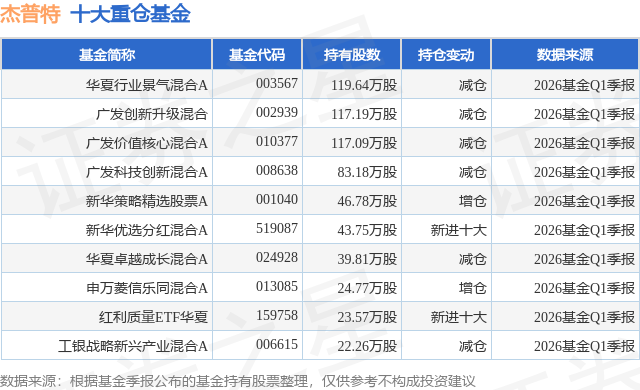 根据2026基金Q1季报公募基金重仓股数据,重仓该股的公募基金共60家,其中持有数量最多的公募基金为华夏基金的华夏行业景气混合A。华夏行业景气混合A目前规模为82.71亿元,最新净值5.9648(4月24日),较上一交易日下跌0.76%,近一年上涨93.4%。该公募基金现任基金经理为钟帅。钟帅在任的基金产品包括:华夏远见成长一年持有混合A,管理时间为2022年9月20日至今,期间收益率为65.53%;华夏招鑫鸿瑞混合A,管理时间为2024年1月16日至今,期间收益率为164.22%;华夏卓越成长混合A,管理时间为2025年8月12日至今,期间收益率为42.38%。