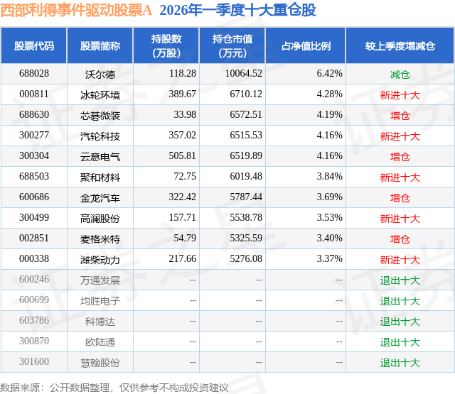 根据2026基金Q1季报公募基金重仓股数据,重仓该股的公募基金共8家,其中持有数量最多的公募基金为西部利得基金的西部利得事件驱动股票A。西部利得事件驱动股票A目前规模为8.79亿元,最新净值4.525(4月24日),较上一交易日下跌1.27%,近一年上涨80.45%。该公募基金现任基金经理为张昌平。张昌平在任的基金产品包括:西部利得时代动力混合发起A,管理时间为2022年5月31日至今,期间收益率为84.54%;西部利得新富混合A,管理时间为2025年8月15日至今,期间收益率为12.4%;西部利得CES芯片指数增强A,管理时间为2025年9月6日至今,期间收益率为29.91%。