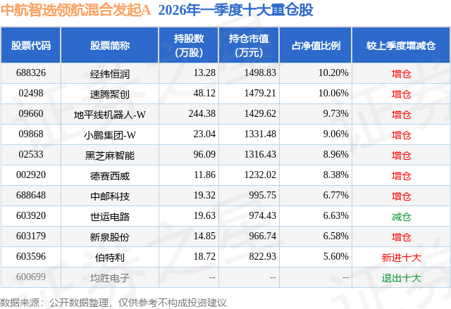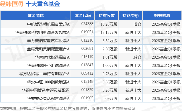 根据2026基金Q1季报公募基金重仓股数据,重仓该股的公募基金共10家,其中持有数量最多的公募基金为中航基金的中航智选领航混合发起A。中航智选领航混合发起A目前规模为0.37亿元,最新净值0.9506(4月24日),较上一交易日上涨0.49%。该公募基金现任基金经理为王森 郑常斌。王森在任的基金产品包括:中航恒宇港股通价值优选混合发起A,管理时间为2023年9月27日至今,期间收益率为25.0%;中航趋势领航混合发起A,管理时间为2024年6月18日至今,期间收益率为147.64%;中航远见领航混合发起A,管理时间为2024年8月30日至今,期间收益率为34.77%;中航优选领航混合发起A,管理时间为2024年12月24日至今,期间收益率为72.43%。