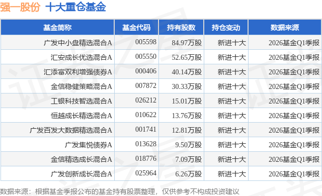 根据2026基金Q1季报公募基金重仓股数据,重仓该股的公募基金共30家,其中持有数量最多的公募基金为广发基金的广发中小盘精选混合A。广发中小盘精选混合A目前规模为33.07亿元,最新净值2.9614(4月24日),较上一交易日下跌0.64%,近一年上涨60.51%。该公募基金现任基金经理为陈韫中。陈韫中在任的基金产品包括:广发成长启航混合A,管理时间为2024年3月19日至今,期间收益率为206.44%;广发科技动力股票,管理时间为2024年5月31日至今,期间收益率为129.63%;广发小盘成长混合(LOF)A,管理时间为2025年3月25日至今,期间收益率为51.09%。