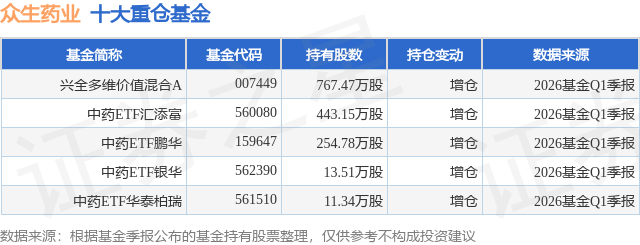 根据2026基金Q1季报公募基金重仓股数据,重仓该股的公募基金共5家,其中持有数量最多的公募基金为兴证全球基金的兴全多维价值混合A。兴全多维价值混合A目前规模为41.98亿元,最新净值2.9398(4月24日),较上一交易日上涨1.15%,近一年上涨65.57%。该公募基金现任基金经理为杨世进。杨世进在任的基金产品包括:兴全合丰三年持有混合,管理时间为2023年8月28日至今,期间收益率为51.09%;兴全趋势投资混合(LOF),管理时间为2025年7月2日至今,期间收益率为56.41%。