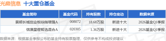 根据2026基金Q1季报公募基金重仓股数据,重仓该股的公募基金共2家,其中持有数量最多的公募基金为景顺长城基金的景顺长城创业板综指增强A。景顺长城创业板综指增强A目前规模为5.56亿元,最新净值2.5291(4月24日),较上一交易日下跌0.84%,近一年上涨77.29%。该公募基金现任基金经理为黎海威。黎海威在任的基金产品包括:景顺长城沪深300指数增强A,管理时间为2013年10月29日至今,期间收益率为229.74%;景顺长城量化精选股票A,管理时间为2015年2月4日至今,期间收益率为144.39%;景顺长城量化新动力股票A,管理时间为2016年7月13日至今,期间收益率为151.67%;景顺长城量化小盘股票A,管理时间为2018年2月6日至今,期间收益率为149.21%。