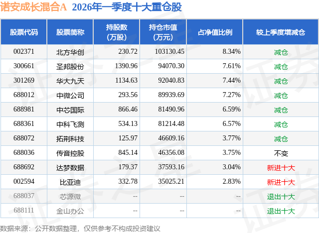 根据2026基金Q1季报公募基金重仓股数据,重仓该股的公募基金共8家,其中持有数量最多的公募基金为诺安基金的诺安成长混合A。诺安成长混合A目前规模为108.11亿元,最新净值1.96(4月24日),较上一交易日上涨0.72%,近一年上涨36.59%。该公募基金现任基金经理为刘慧影。刘慧影在任的基金产品包括:诺安优化配置混合A,管理时间为2022年8月3日至今,期间收益率为84.78%;诺安积极回报混合A,管理时间为2023年9月29日至今,期间收益率为15.48%。