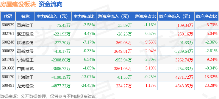 从资金流向上来看,当日房屋建设板块主力资金净流出1.6亿元,游资资金净流入7016.56万元,散户资金净流入8951.72万元。房屋建设板块个股资金流向见下表: