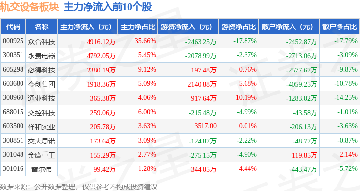 从资金流向上来看,当日轨交设备板块主力资金净流出1.52亿元,游资资金净流入1.15亿元,散户资金净流入3748.41万元。轨交设备板块个股资金流向见下表: