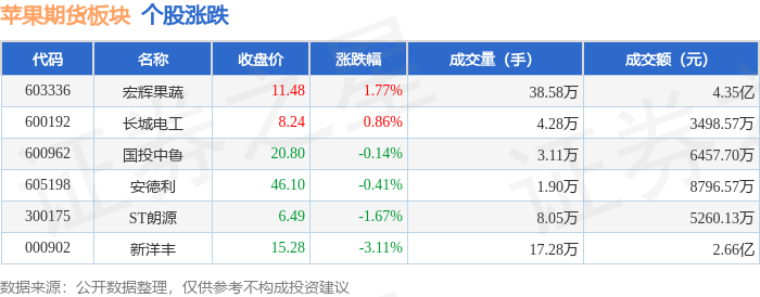 证券之星消息,4月27日苹果期货板块较上一交易日下跌1.05%,新洋丰领跌。当日上证指数报收于4086.34,上涨0.16%。深证成指报收于14995.75,上涨0.37%。苹果期货板块个股涨跌见下表: