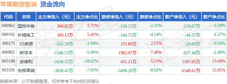 从资金流向上来看,当日苹果期货板块主力资金净流出5587.54万元,游资资金净流出1218.04万元,散户资金净流入6805.58万元。苹果期货板块个股资金流向见下表: