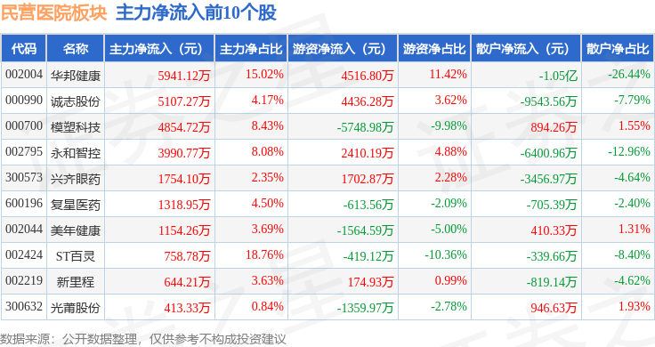 从资金流向上来看,当日民营医院板块主力资金净流出3.81亿元,游资资金净流入4342.92万元,散户资金净流入3.37亿元。民营医院板块个股资金流向见下表: