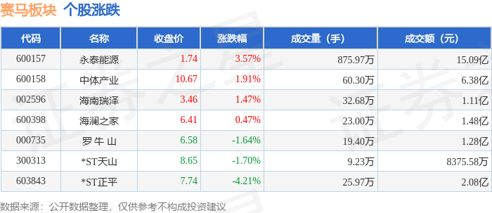 证券之星消息,4月27日赛马板块较上一交易日上涨1.36%,永泰能源领涨。当日上证指数报收于4086.34,上涨0.16%。深证成指报收于14995.75,上涨0.37%。赛马板块个股涨跌见下表:
