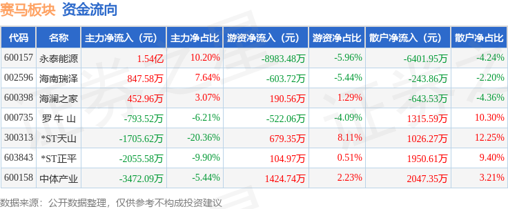 从资金流向上来看,当日赛马板块主力资金净流入8659.16万元,游资资金净流出7709.64万元,散户资金净流出949.51万元。赛马板块个股资金流向见下表: