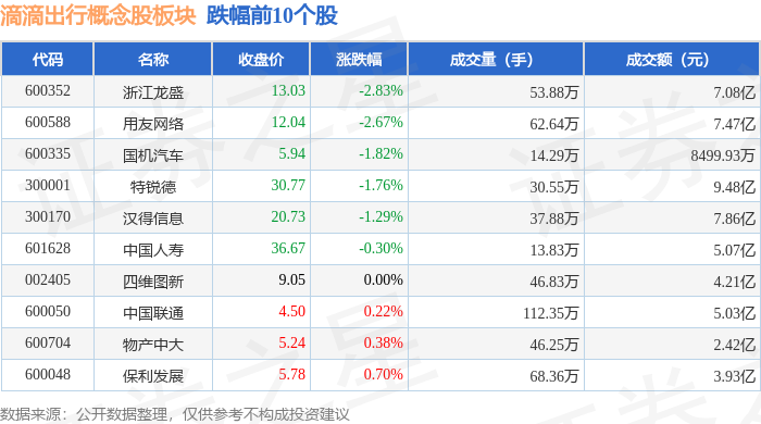 证券之星消息,4月27日滴滴出行概念股板块较上一交易日下跌0.32%,浙江龙盛领跌。当日上证指数报收于4086.34,上涨0.16%。深证成指报收于14995.75,上涨0.37%。滴滴出行概念股板块个股涨跌见下表:
