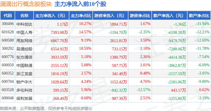 从资金流向上来看,当日滴滴出行概念股板块主力资金净流入1.36亿元,游资资金净流入8959.75万元,散户资金净流出2.26亿元。滴滴出行概念股板块个股资金流向见下表: