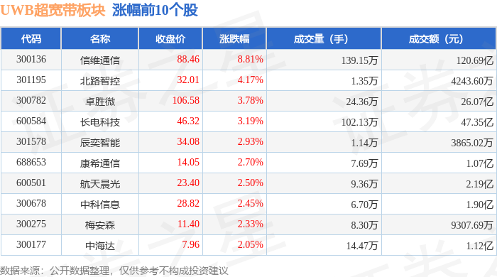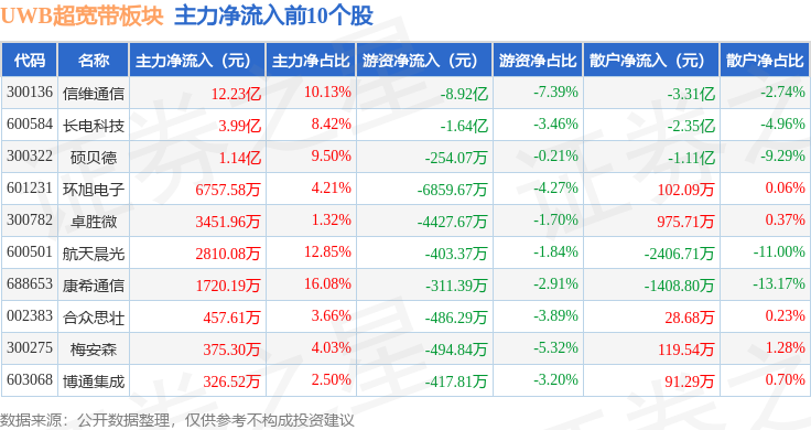 从资金流向上来看,当日UWB超宽带板块主力资金净流入16.44亿元,游资资金净流出11.13亿元,散户资金净流出5.31亿元。UWB超宽带板块个股资金流向见下表: