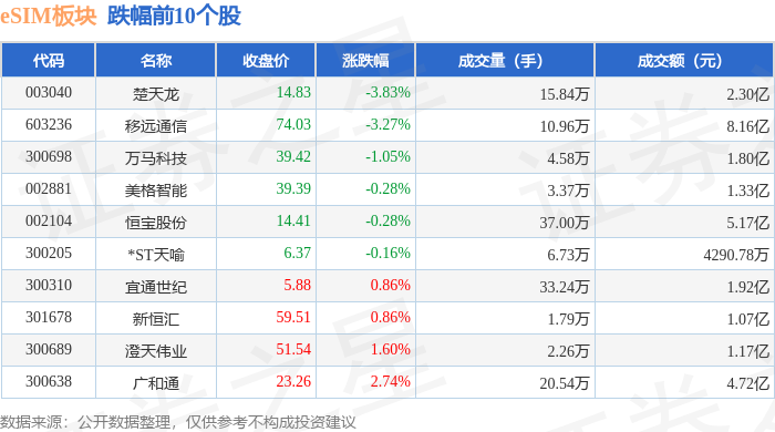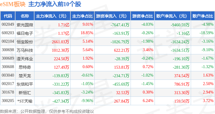 从资金流向上来看,当日eSIM板块主力资金净流入1.56亿元,游资资金净流出6204.53万元,散户资金净流出9442.18万元。eSIM板块个股资金流向见下表: