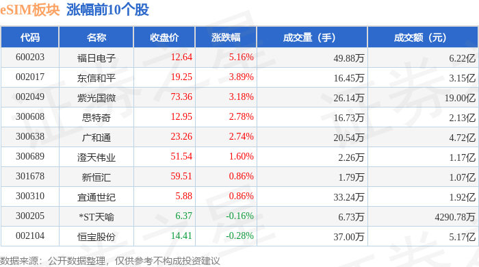 证券之星消息,4月27日eSIM板块较上一交易日上涨1.44%,福日电子领涨。当日上证指数报收于4086.34,上涨0.16%。深证成指报收于14995.75,上涨0.37%。eSIM板块个股涨跌见下表: