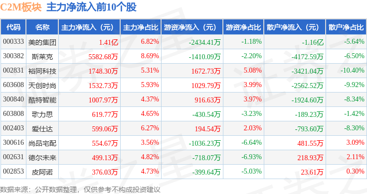 从资金流向上来看,当日C2M板块主力资金净流出4159.57万元,游资资金净流出5119.04万元,散户资金净流入9278.6万元。C2M板块个股资金流向见下表: