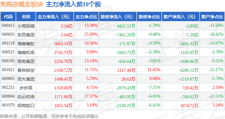 从资金流向上来看,当日免税店概念板块主力资金净流入5.23亿元,游资资金净流出2.2亿元,散户资金净流出3.03亿元。免税店概念板块个股资金流向见下表:
