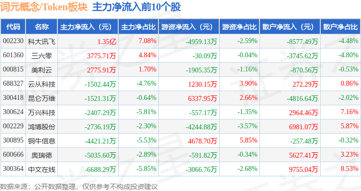从资金流向上来看,当日词元概念/Token板块主力资金净流出19.11亿元,游资资金净流入4.66亿元,散户资金净流入14.44亿元。词元概念/Token板块个股资金流向见下表:
