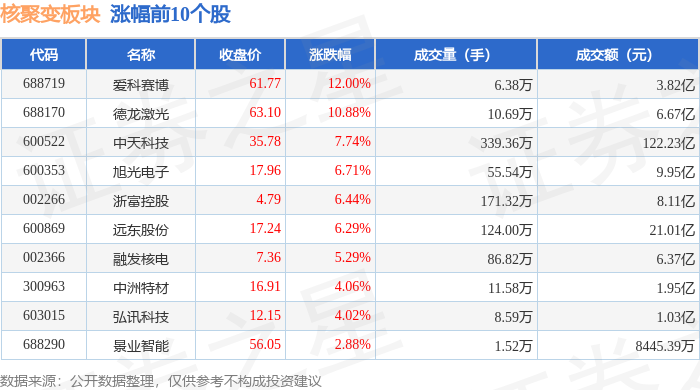 证券之星消息,4月27日核聚变板块较上一交易日上涨0.15%,爱科赛博领涨。当日上证指数报收于4086.34,上涨0.16%。深证成指报收于14995.75,上涨0.37%。核聚变板块个股涨跌见下表: