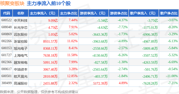 从资金流向上来看,当日核聚变板块主力资金净流出13.02亿元,游资资金净流出9.12亿元,散户资金净流入22.14亿元。核聚变板块个股资金流向见下表: