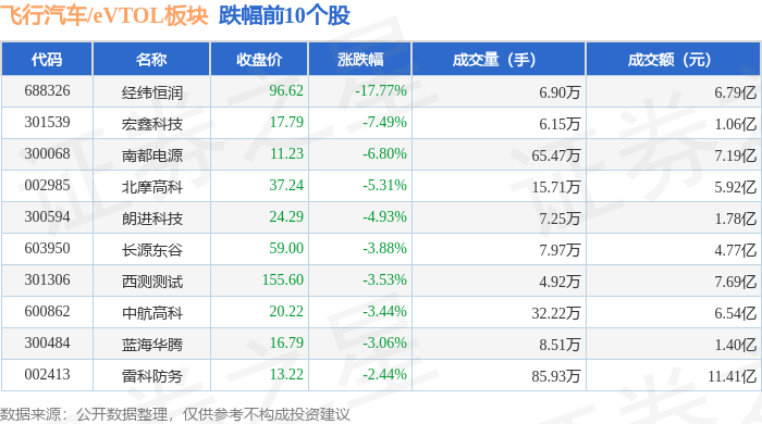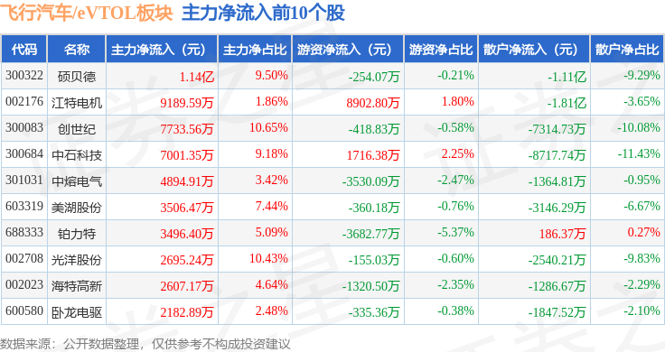 从资金流向上来看,当日飞行汽车/eVTOL板块主力资金净流出13.22亿元,游资资金净流入1.77亿元,散户资金净流入11.45亿元。飞行汽车/eVTOL板块个股资金流向见下表: