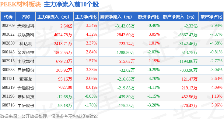 从资金流向上来看,当日PEEK材料板块主力资金净流出1002.44万元,游资资金净流入4585.58万元,散户资金净流出3583.15万元。PEEK材料板块个股资金流向见下表: