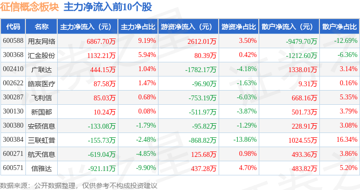 从资金流向上来看,当日征信概念板块主力资金净流出817.54万元,游资资金净流入2140.43万元,散户资金净流出1322.88万元。征信概念板块个股资金流向见下表: