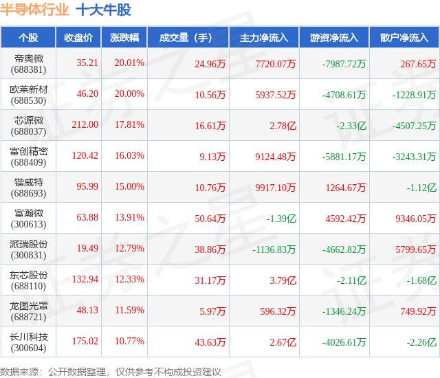 个股表现方面,半导体行业当日领涨股为帝奥微(688381),该股当日报收35.21,上涨20.01%,成交量24.96万,主力资金净流入7720.07万元。欧莱新材(688530)以上涨20.0%紧随其后,该股当日成交量10.56万,主力资金净流入5937.52万元。除此之外,芯源微(688037)、富创精密(688409)、锴威特(688693)均进入当日牛股之列。具体个股列表见下表: