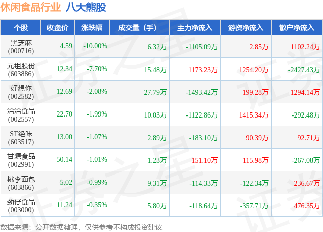 个股表现方面,休闲食品行业当日领跌股为黑芝麻(000716),该股当日报收4.59,下跌10.0%,成交量6.32万,主力资金净流出1105.09万元。元祖股份(603886)以下跌7.7%紧随其后,该股当日成交量15.48万,主力资金净流入1173.23万元。除此之外,好想你(002582)、洽洽食品(002557)、ST绝味(603517)均进入当日熊股之列。具体个股列表见下表: