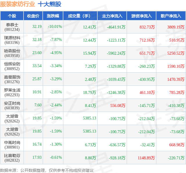 个股表现方面,服装家纺行业当日领跌股为泰慕士(001234),该股当日报收32.19,下跌10.01%,成交量12.41万,主力资金净流出4641.91万元。璞源材料(603196)以下跌7.87%紧随其后,该股当日成交量12.44万,主力资金净流出1223.11万元。除此之外,哈森股份(603958)、恒辉安防(300952)、嘉曼服饰(301276)均进入当日熊股之列。具体个股列表见下表: