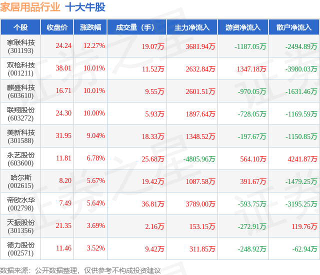 个股表现方面,家居用品行业当日领涨股为家联科技(301193),该股当日报收24.24,上涨12.27%,成交量19.07万,主力资金净流入3681.94万元。双枪科技(001211)以上涨10.01%紧随其后,该股当日成交量11.52万,主力资金净流入2632.84万元。除此之外,麒盛科技(603610)、联翔股份(603272)、美新科技(301588)均进入当日牛股之列。具体个股列表见下表: