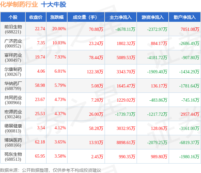 个股表现方面,化学制药行业当日领涨股为前沿生物(688221),该股当日报收22.74,上涨20.0%,成交量70.88万,主力资金净流出4678.11万元。广济药业(000952)以上涨10.03%紧随其后,该股当日成交量23.24万,主力资金净流入1802.32万元。除此之外,富祥药业(300497)、尔康制药(300267)、华纳药厂(688799)均进入当日牛股之列。具体个股列表见下表: