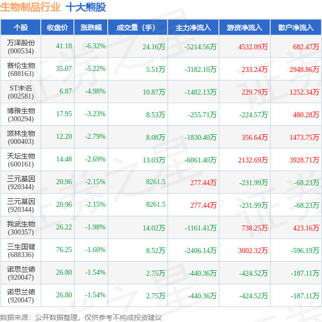 个股表现方面,生物制品行业当日领跌股为万泽股份(000534),该股当日报收41.18,下跌6.32%,成交量24.16万,主力资金净流出5214.56万元。赛伦生物(688163)以下跌5.22%紧随其后,该股当日成交量5.51万,主力资金净流出3182.1万元。除此之外,ST未名(002581)、博雅生物(300294)、派林生物(000403)均进入当日熊股之列。具体个股列表见下表: