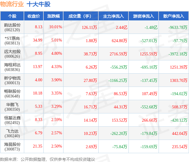 个股表现方面,物流行业当日领涨股为韵达股份(002120),该股当日报收8.13,上涨10.01%,成交量126.11万,主力资金净流入2.44亿元。*ST原尚(603813)以上涨5.01%紧随其后,该股当日成交量1.88万,主力资金净流入624.8万元。除此之外,远大控股(000626)、海程邦达(603836)、新宁物流(300013)均进入当日牛股之列。具体个股列表见下表: