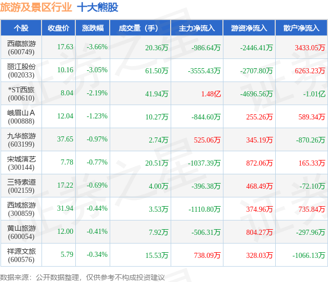 个股表现方面,旅游及景区行业当日领跌股为西藏旅游(600749),该股当日报收17.63,下跌3.66%,成交量20.36万,主力资金净流出986.64万元。丽江股份(002033)以下跌3.05%紧随其后,该股当日成交量61.5万,主力资金净流出3555.43万元。除此之外,*ST西旅(000610)、峨眉山A(000888)、九华旅游(603199)均进入当日熊股之列。具体个股列表见下表: