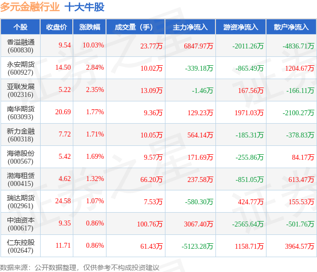 个股表现方面,多元金融行业当日领涨股为香溢融通(600830),该股当日报收9.54,上涨10.03%,成交量23.77万,主力资金净流入6847.97万元。永安期货(600927)以上涨2.84%紧随其后,该股当日成交量10.02万,主力资金净流出339.18万元。除此之外,亚联发展(002316)、南华期货(603093)、新力金融(600318)均进入当日牛股之列。具体个股列表见下表: