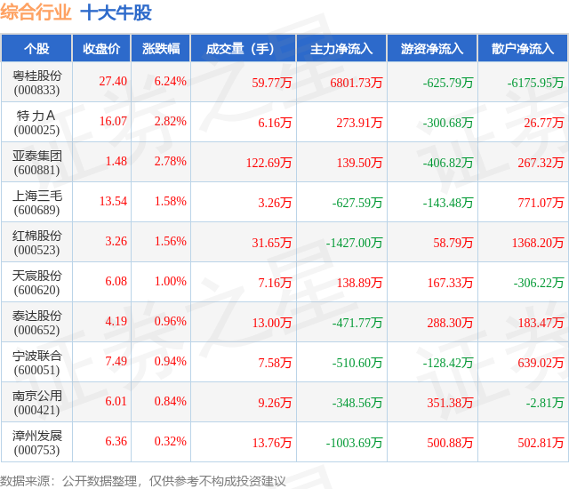个股表现方面,综合行业当日领涨股为粤桂股份(000833),该股当日报收27.4,上涨6.24%,成交量59.77万,主力资金净流入6801.73万元。特 力A(000025)以上涨2.82%紧随其后,该股当日成交量6.16万,主力资金净流入273.91万元。除此之外,亚泰集团(600881)、上海三毛(600689)、红棉股份(000523)均进入当日牛股之列。具体个股列表见下表: