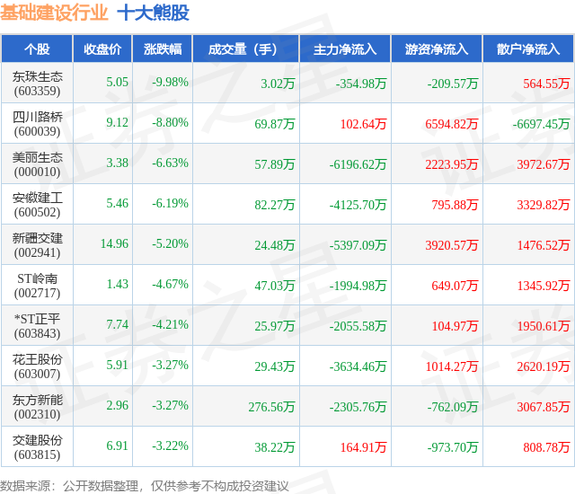 个股表现方面,基础建设行业当日领跌股为东珠生态(603359),该股当日报收5.05,下跌9.98%,成交量3.02万,主力资金净流出354.98万元。四川路桥(600039)以下跌8.8%紧随其后,该股当日成交量69.87万,主力资金净流入102.64万元。除此之外,美丽生态(000010)、安徽建工(600502)、新疆交建(002941)均进入当日熊股之列。具体个股列表见下表: