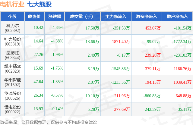 个股表现方面,电机行业当日领跌股为科力尔(002892),该股当日报收10.42,下跌4.84%,成交量17.5万,主力资金净流出351.53万元。神力股份(603819)以下跌4.38%紧随其后,该股当日成交量18.66万,主力资金净流入1871.4万元。除此之外,星德胜(603344)、凯中精密(002823)、华阳智能(301502)均进入当日熊股之列。具体个股列表见下表: