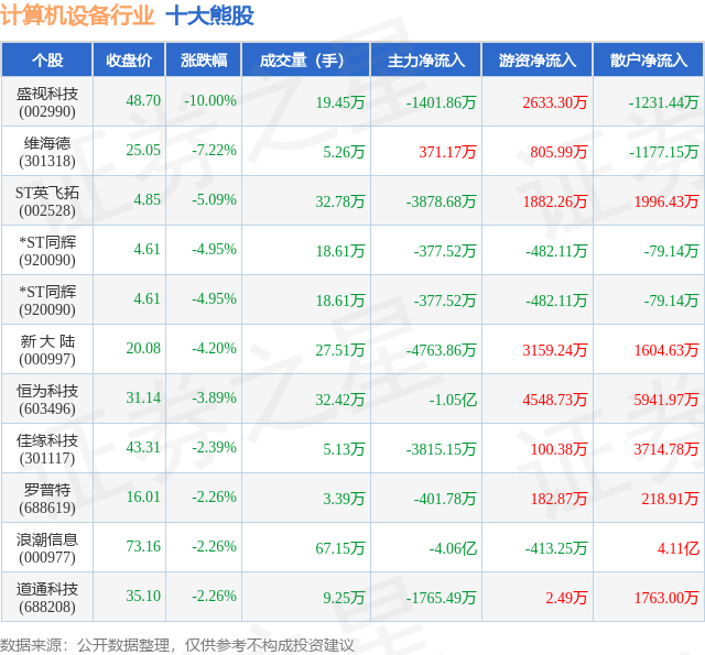 个股表现方面,计算机设备行业当日领跌股为盛视科技(002990),该股当日报收48.7,下跌10.0%,成交量19.45万,主力资金净流出1401.86万元。维海德(301318)以下跌7.22%紧随其后,该股当日成交量5.26万,主力资金净流入371.17万元。除此之外,ST英飞拓(002528)、*ST同辉(920090)、*ST同辉(920090)均进入当日熊股之列。具体个股列表见下表: