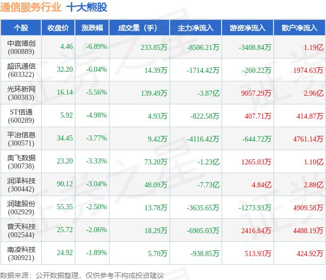 个股表现方面,通信服务行业当日领跌股为中嘉博创(000889),该股当日报收4.46,下跌6.89%,成交量233.85万,主力资金净流出8506.21万元。超讯通信(603322)以下跌6.04%紧随其后,该股当日成交量14.39万,主力资金净流出1714.42万元。除此之外,光环新网(300383)、ST信通(600289)、平治信息(300571)均进入当日熊股之列。具体个股列表见下表: