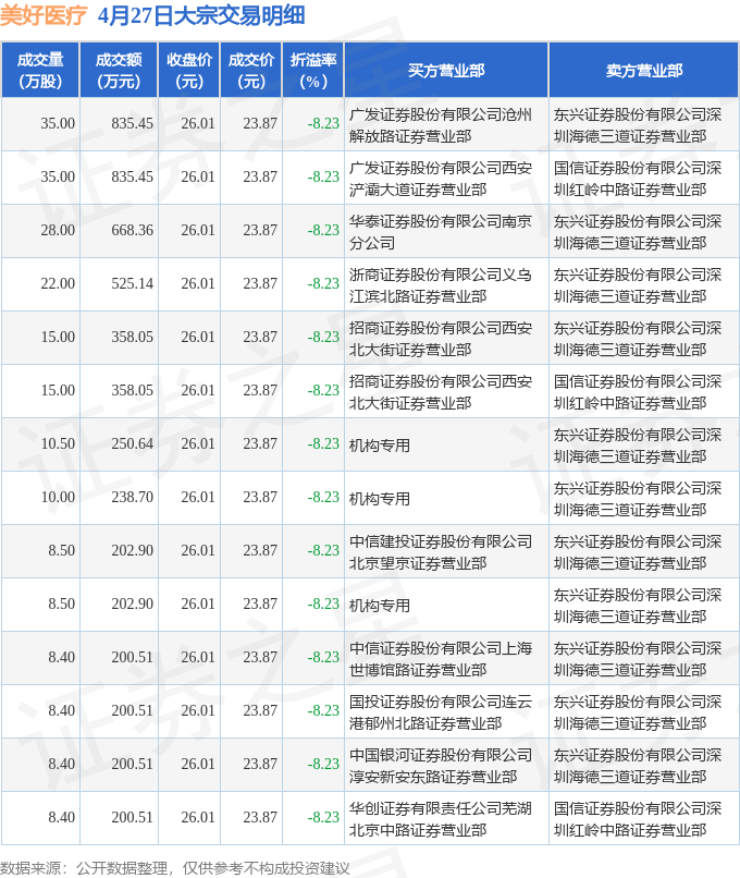 证券之星消息,4月27日美好医疗发生大宗交易,交易数据如下: