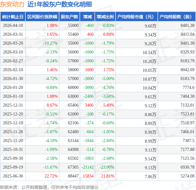 从股价来看,2026年3月31日至2026年4月10日,东安动力区间涨幅为1.98%,在此期间股东户数减少460.0户,减幅为0.83%。