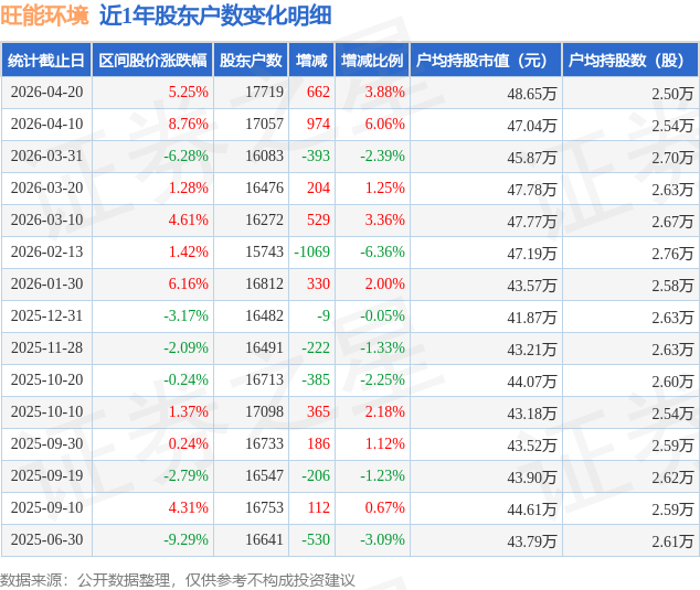 从股价来看,2026年4月10日至2026年4月20日,旺能环境区间涨幅为5.25%,在此期间股东户数增加662.0户,增幅为3.88%。
