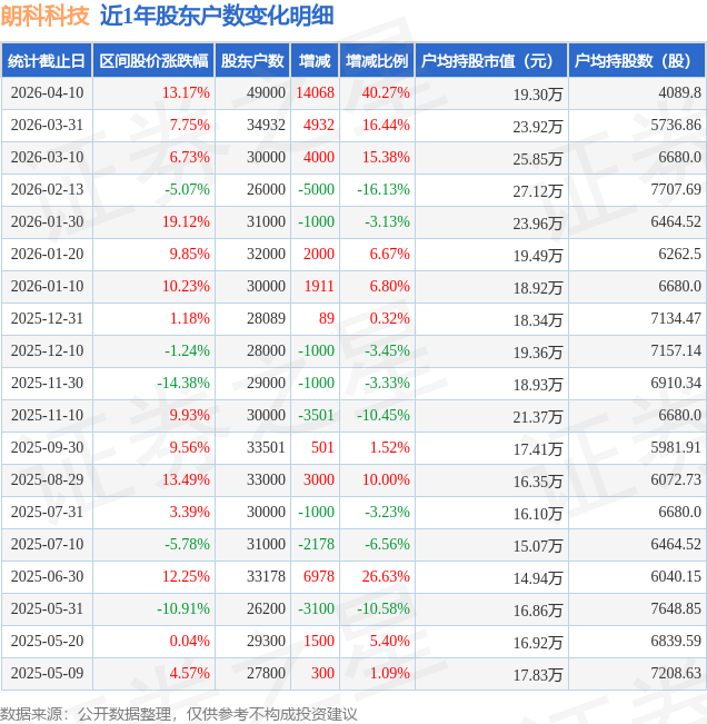 证券之星消息,近日朗科科技披露,截至2026年4月10日公司股东户数为4.9万户,较3月31日增加1.41万户,增幅为40.27%。户均持股数量由上期的5737.0股减少至4090.0股,户均持股市值为19.3万元。