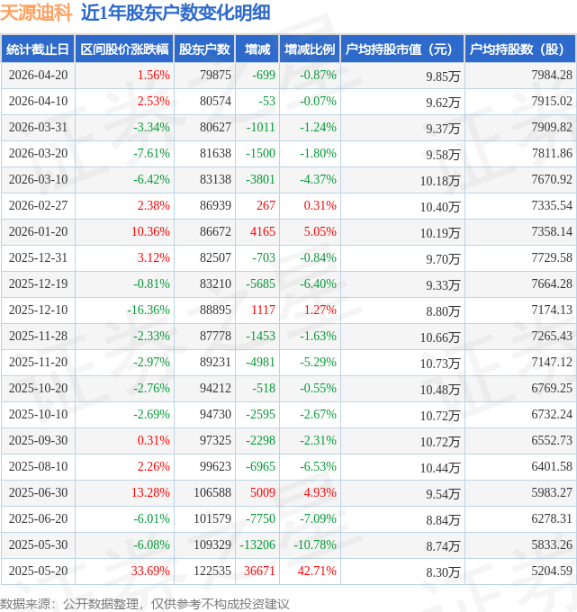 从股价来看,2026年4月10日至2026年4月20日,天源迪科区间涨幅为1.56%,在此期间股东户数减少699.0户,减幅为0.87%。