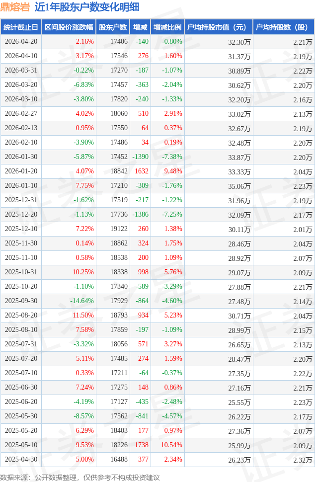 从股价来看,2026年4月10日至2026年4月20日,鼎熔岩区间涨幅为2.16%,在此期间股东户数减少140.0户,减幅为0.8%。
