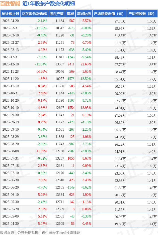 从股价来看,2026年3月31日至2026年4月20日,百胜智能区间跌幅为2.14%,在此期间股东户数增加587.0户,增幅为5.57%。